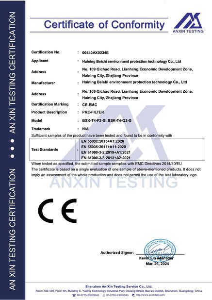Standaard:CE Aantal:00440AX0234E Uitgiftedatum:2024-03-26 Scope / Range:PRE-FILTER Uitgegeven door:AN XIN TESTING CERTIFICATION |