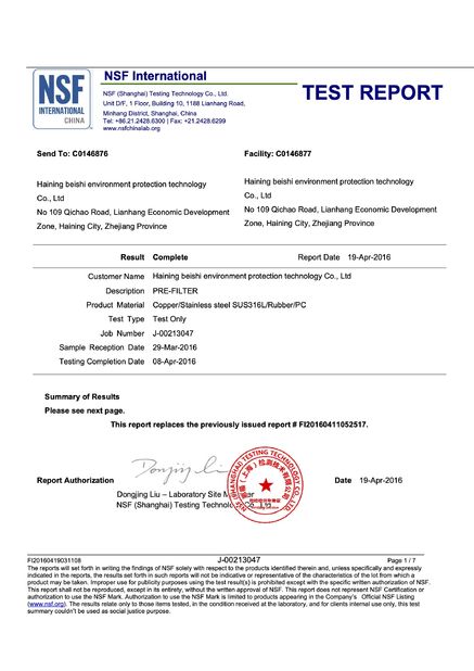 Standaard:NSF Aantal:J-00213047 Uitgiftedatum:2016-04-19 Scope / Range:PRE-FILTER Uitgegeven door:NSF (Shanghai) Testing Technology Co., Ltd |